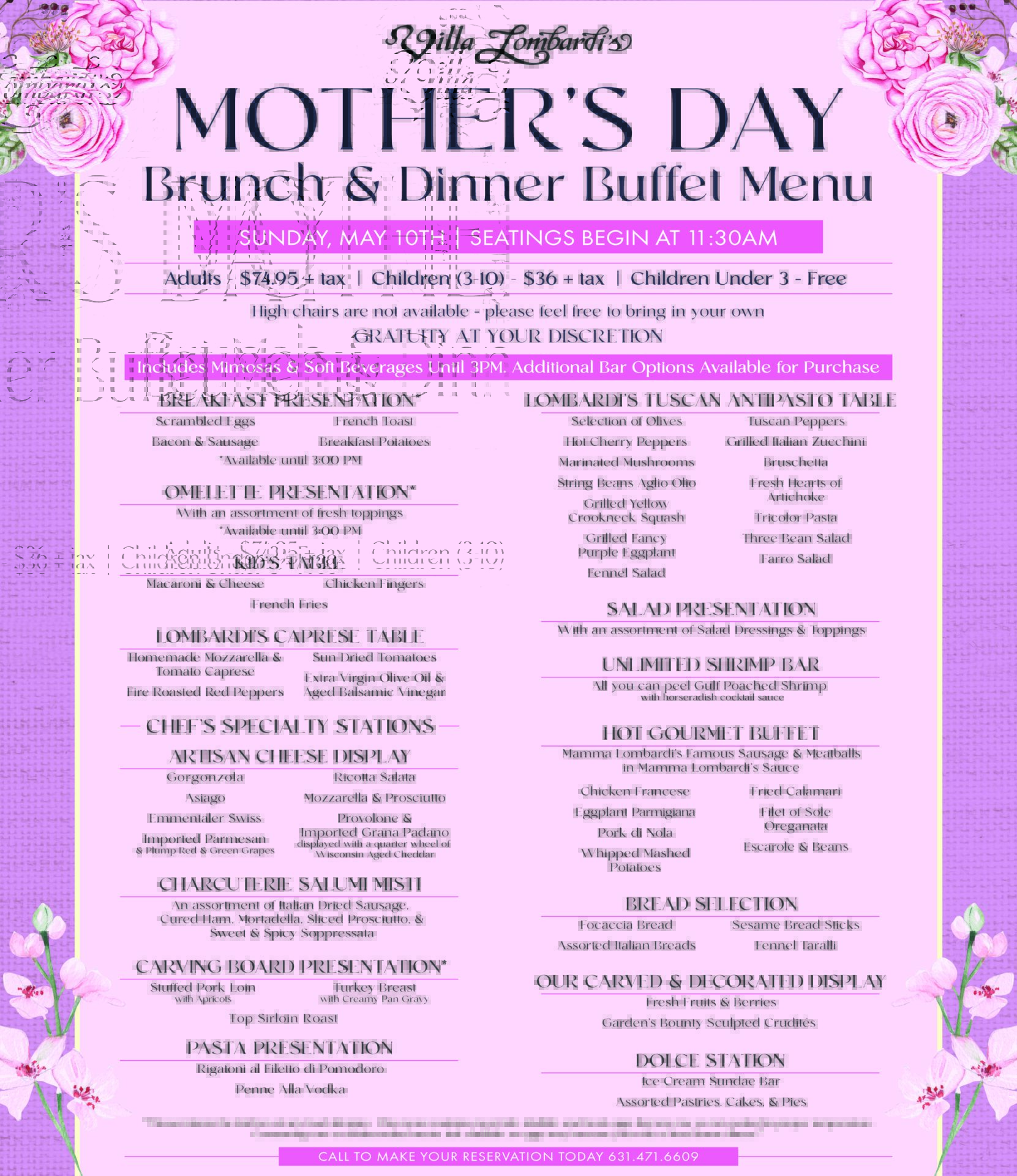 Seatings start at 11:30 AM. Call 631.471.6609 to reserve your table today.