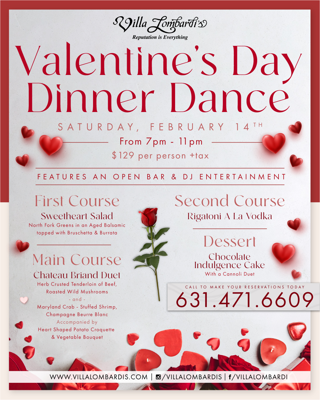 Join us at Villa Lombardi’s Valentine’s Day Dinner Dance on February 14th from 7–11 PM.